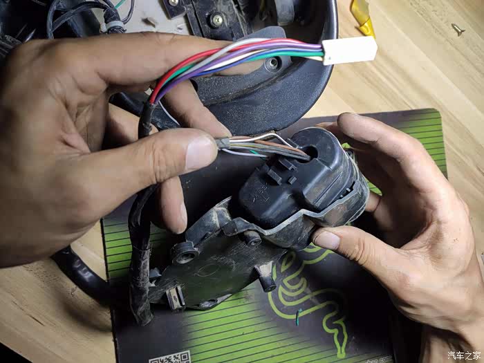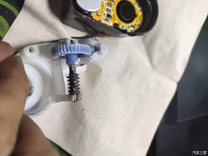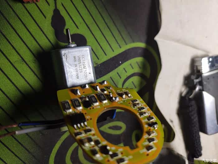 前两天送孩子上学,回来发现解锁时反光镜不动了,在车里用手动开关也不好用,右边的正常,证明系统没有问题,也能听到里面马达有动作,只是不能到底,开始以为是齿轮坏了,后来换上新的,拆下旧的逐项测试,是线路板的问题,电机与齿轮是正常的。