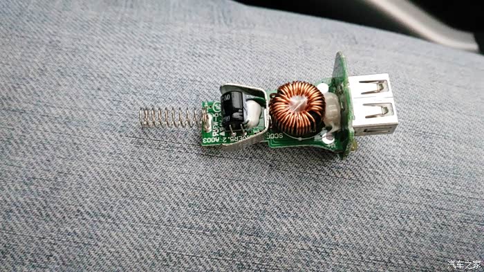 6)将车载充电头拆开,在底部弹簧和侧方触点,单独接2根线出来。再将充电头恢复。