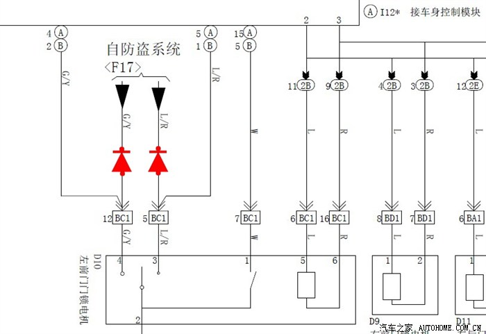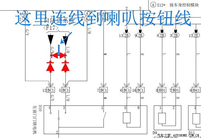 要改装的话先把这两条线剪断,再串入二极管,作用就是分隔遥控信号和车上的按键信号!