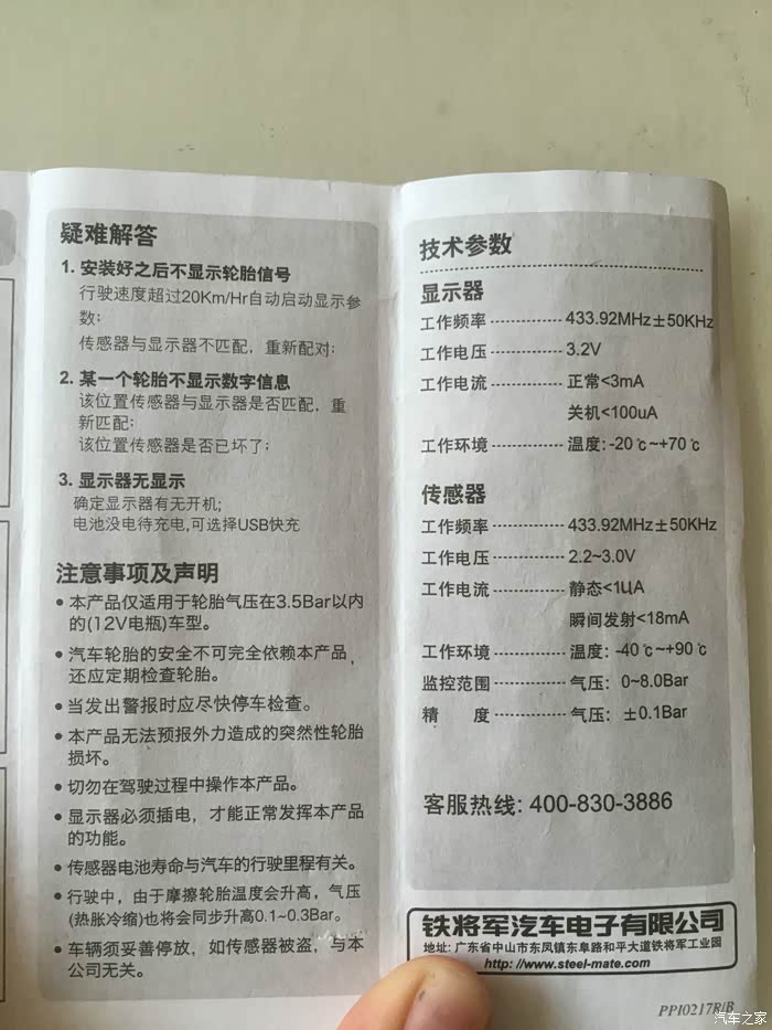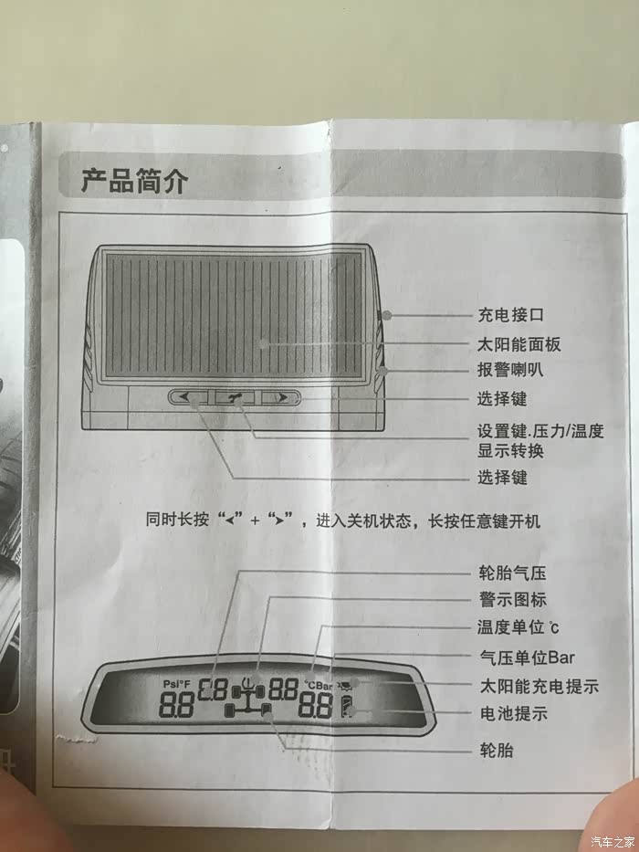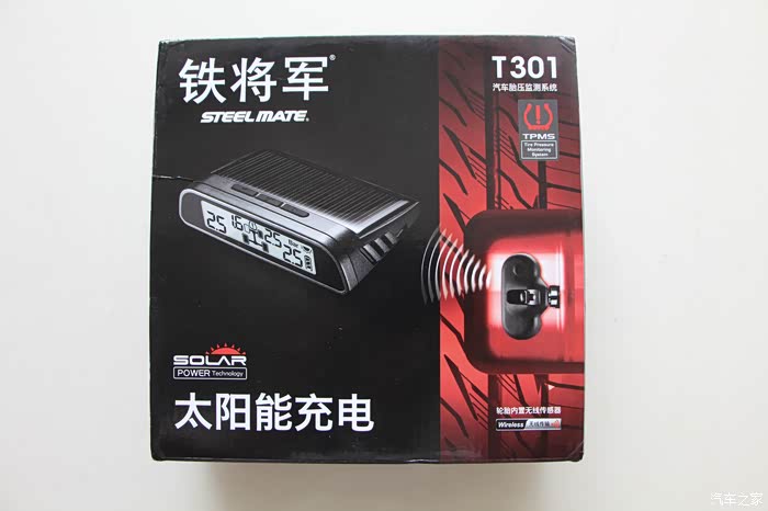 对胎压监测也有过一些了解,分直接胎压监测和间接胎压监测。间接胎压监测就是基于ABS的车轮转速传感器,对左右两个车轮转速进行对比,气压不足的一侧轮胎直径会相对变小,相同的速度轮胎转速要高一些,缺点是无法直观的看到轮胎压力和温度,左右两个轮胎同等缺气的情况下是监测不到的,大众的一些车就配备了间接胎压监测,同学的朗逸有此配置,同学曾对我说,有次出现了胎压报警,但是下车查看没事,自己手里又没有胎压计,就这么继续跑,结果到家轮胎报废了,这就暴露出间接胎压监测的不足之处。直接胎压监测就是通过传感器实时监控各轮胎的气压和温度,更直观。这次申请成功的试用品就是直接胎压监测——铁将军太阳能内置胎压监测。铁将军的雷达、防盗、胎压监测等汽车配件比较出名。这次测试的型号是铁将军T301,在某购物网站搜了下,铁将军胎压监测销量最高的是960型号,价格600-800,只有一家店铺有售铁将军T301,价格1080元,汽车之家的确下了本了,点个赞。