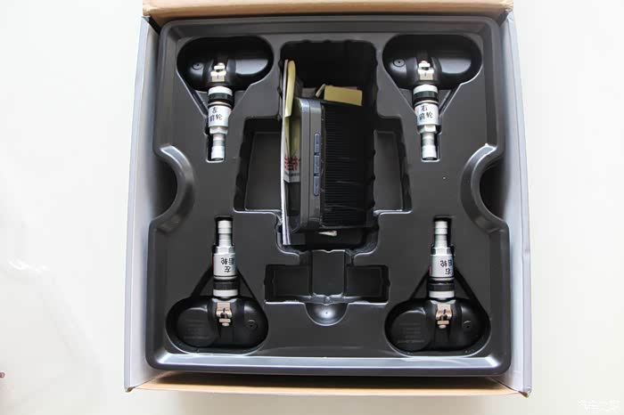 打开盒子,四周是四个传感器分左前、左后、右前、右后,传感器有防水功能,中间是主机、配重块、说明书、3M胶条