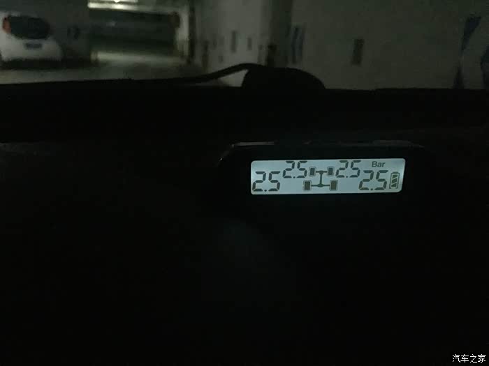 回到家,总共行驶了5公里左右,四个轮胎压力都变成了2.5bar,说明冷车和热车状态的胎压确实不一样,可以理解为摩擦生热