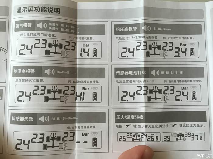 说明书详细列出了各种可能的报警情况:漏气报警、胎压高报警、胎温高报警、传感器电量耗尽报警、传感器失效……以及压力、温度切换的方法。需要注意的是传感器电池正常使用时间为3-5年,据我了解,只有在行驶时传感器才工作,静止时不工作,所以传感器电池寿命和车的使用频率有关系。