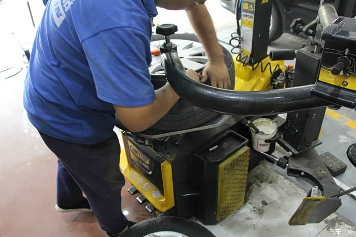 工人用扒胎机扒开气嘴的位置,准备用传感器替换原来的气嘴,后来发现这样不好装,最后还是把轮胎整个扒下来安装的