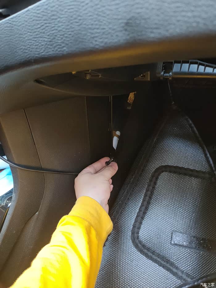 拆开驾驶位下面的盖板,是用卡扣盖住的,同样拍照记录插线的位置。