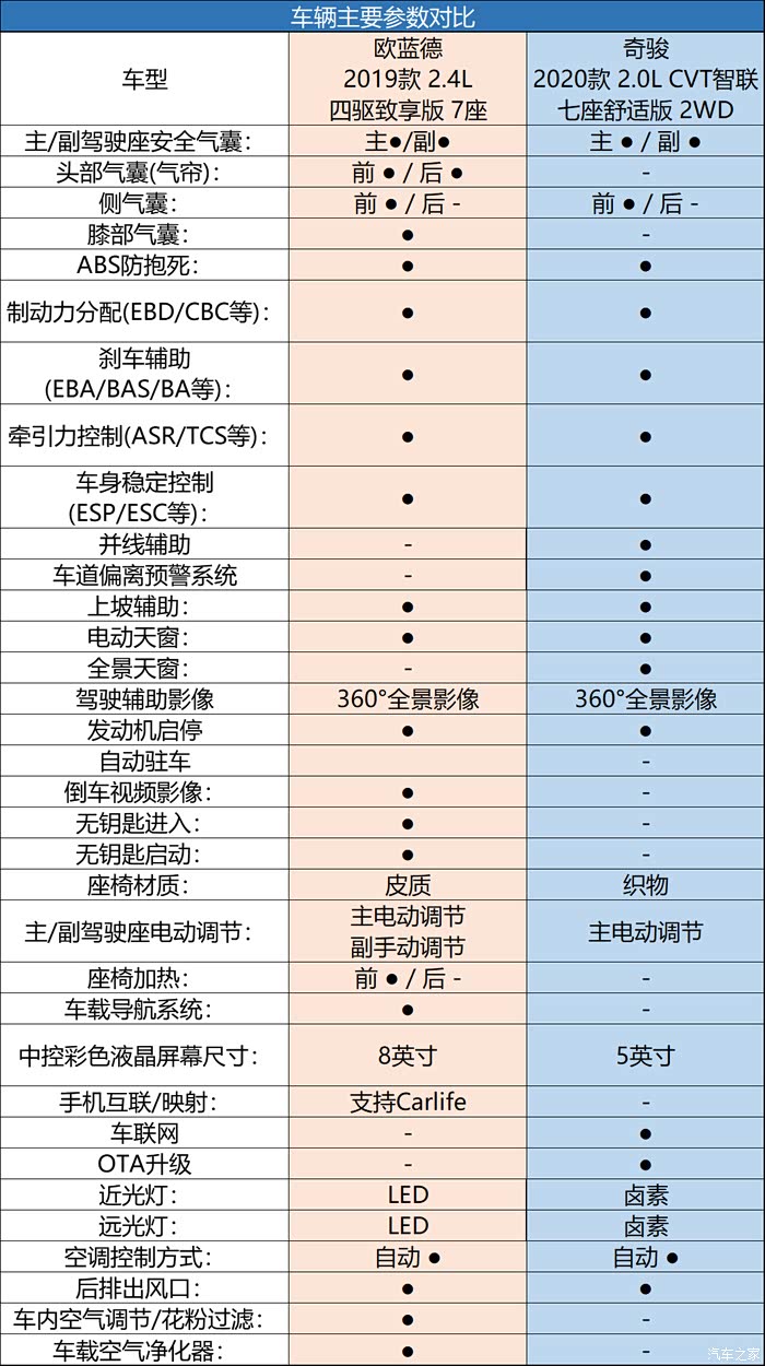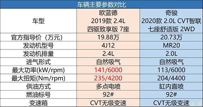 以19.88万的欧蓝德致享版和20.73万的奇骏舒适版举例,两车都采用的是自然吸气发动机,相对而言,欧蓝德2.4L的排量在动力表现上会优于奇...