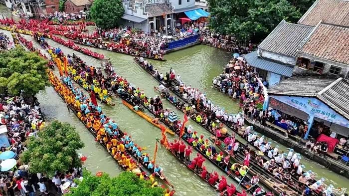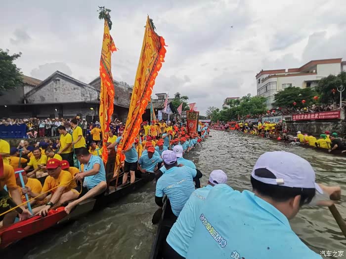 在龙潭龙母庙前,宽敞的龙潭大涌变成了龙舟的“舞池”,来自珠三角各地100多艘龙舟齐聚在这里,陆续登岸完成参拜龙母的传统仪式。装上龙头、龙尾、龙牌,插上彩旗、罗伞,加上身穿不同颜色服装的龙舟队员,河上的龙舟顿时“变身”成为一条条色彩艳丽的“游龙”。