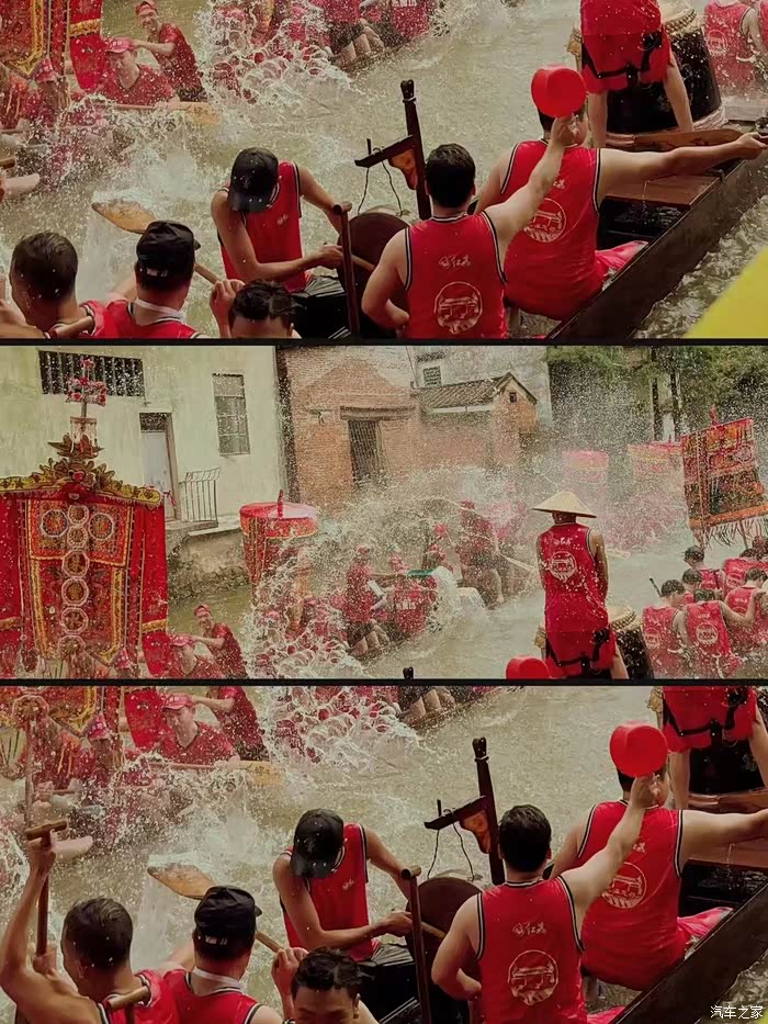 在一片欢声笑语中,龙舟队员们摇旗呐喊、敲锣打鼓、奋力划桨、抖动龙舟,龙舟与龙舟之间互相泼水,构成一幅名为“百龙闹江”的民俗风情画。