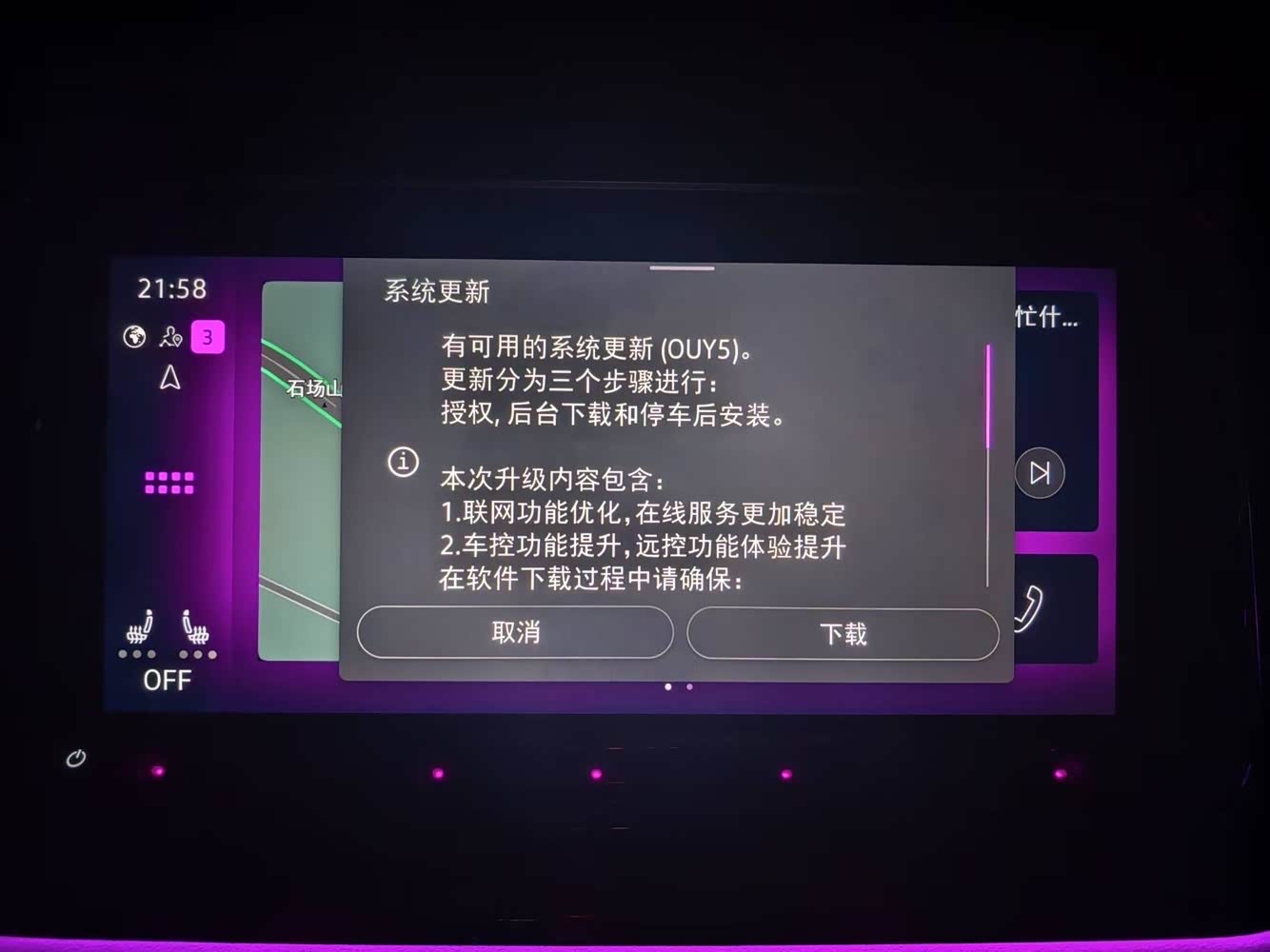 3. 检查更新:进入软件更新选项后,车机系统会自动启动OTA更新检测程序,此时屏幕可能会显示“正在检查更新”的提示,并伴随加载动画。这一过程需保持车辆网络连接稳定(建议连接车载Wi-Fi或手机热点),避免因网络中断导致检测失败。若系统检测到可用更新,屏幕会清晰展示更新的核心信息,包括新系统版本号、更新包大小、发布日期以及详细的更新内容说明——通常会列出新增功能(如语音助手优化、导航地图更新)、性能改进(如卡顿修复、响应速度提升)或漏洞修复等内容。