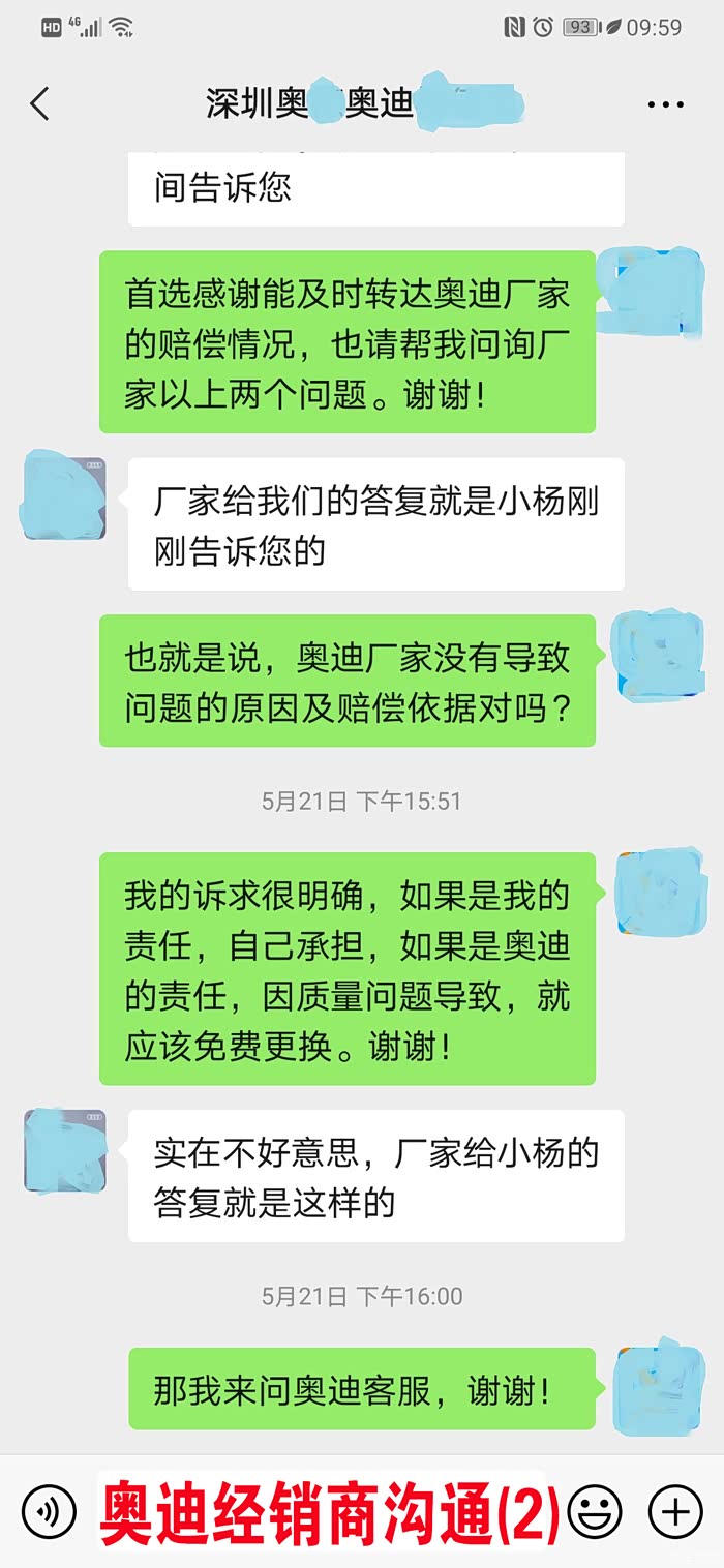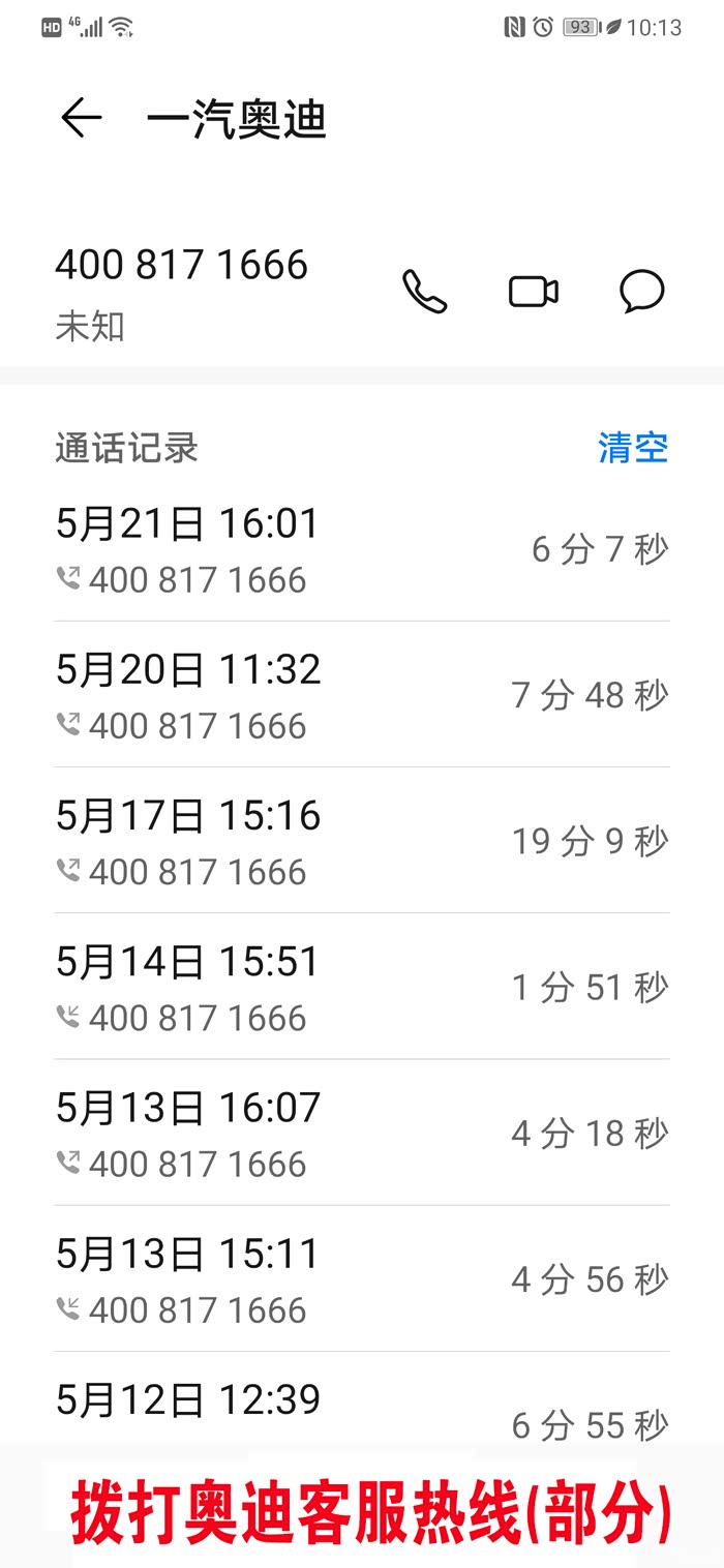 2021年5月31日,至今已拨打奥迪客服热线有十几次,奥迪客服始终是说会尽快联系经销商解决,奥迪经销商始终是说厂家只能部分赔偿。事发将近一个月,奥迪客服从未主动联系过我,奥迪经销商也只是5月12日和5月21日两次回复后不再搭理我。