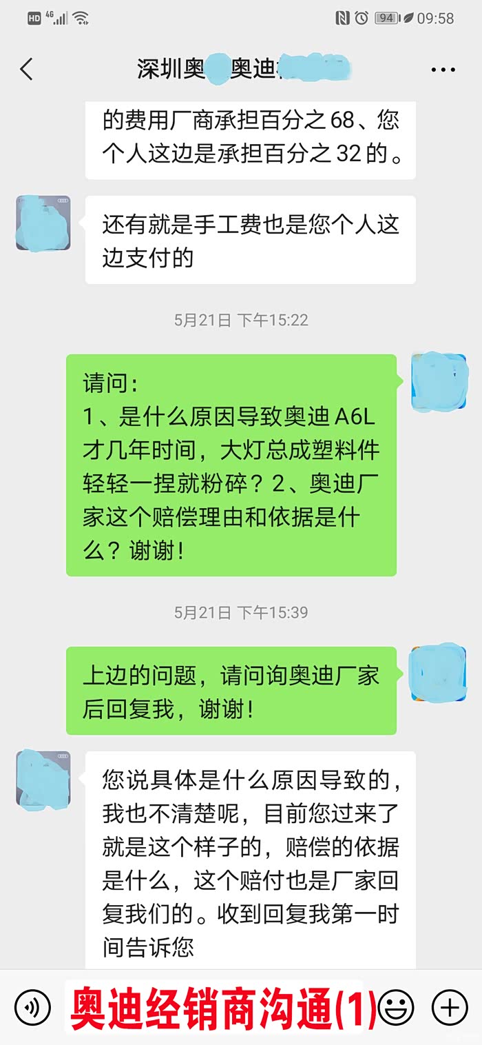 2021年5月7日,前往深圳市罗湖区奥迪经销商做了检查,被告知轻轻一捏就粉碎脱落的是大灯总成塑料,将协助我向厂家申请索赔。5月12日,奥迪经销商回复说厂家只能部分赔偿(材料费用厂家承担68%,我承担32%),我认为是质量问题,要求奥迪厂商全额赔偿,于是拨打了奥迪客服热线,客服说会尽快联系奥迪经销商解决。