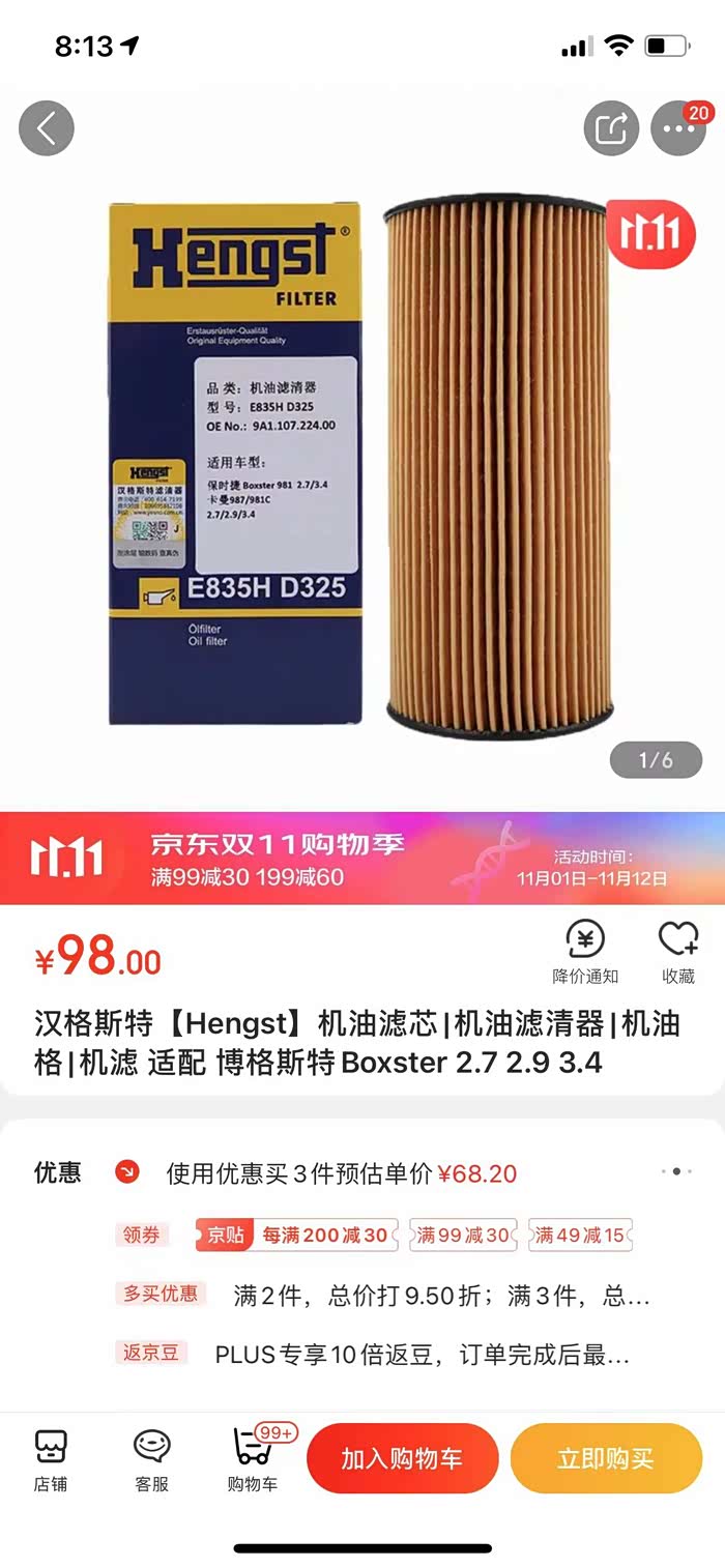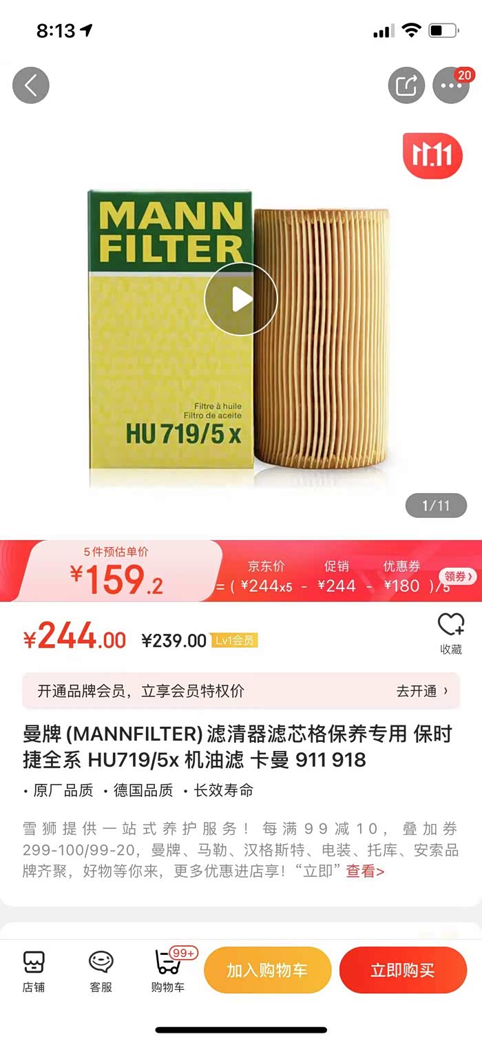 机滤型号:曼牌 HU719/5X 京东旗舰店价格200左右,或者便宜点选择 汉格斯特,稍微便宜点,大概65,那个好就不清楚,曼牌反正一直都挺好,就是贵
