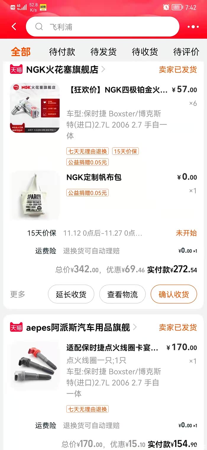 新旧对比,这个是修理厂给我定的保时捷原厂,100一根,当时怕型号不对,买了NGK备用