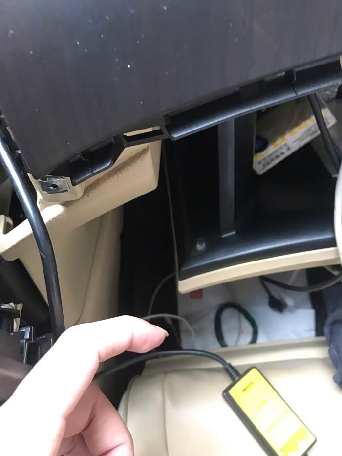扭下两个螺丝之后,就把CD机拉出来。看到后面那个白色接头,拆出来,插我们买回来的。就可以了!