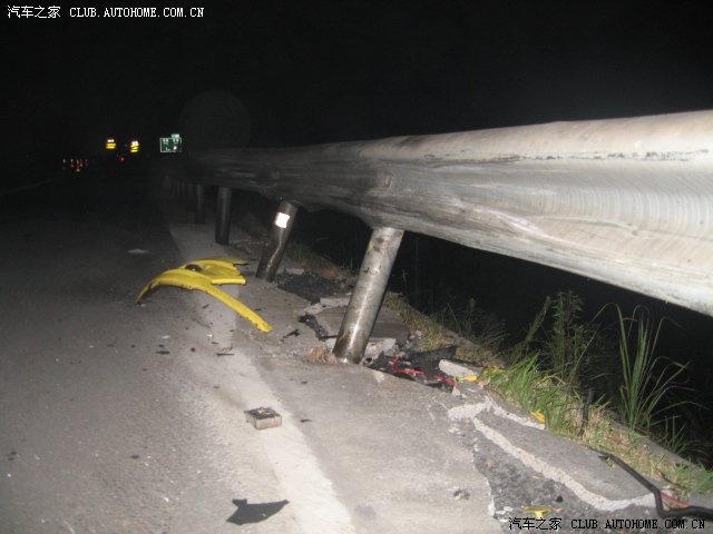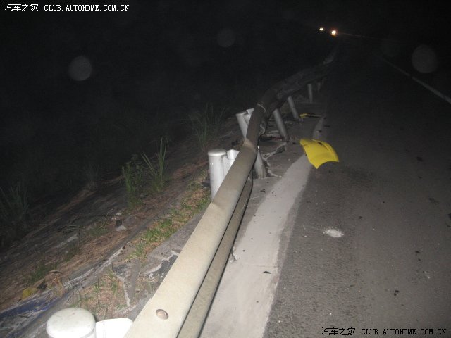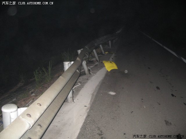 就看见半个发动机已经凹进去,后面保险杠也塌了,屁股进去一块,打不开行李箱。路面有明显轮胎痕迹,护栏的地基水泥块也开裂了,大概也从车辆失控到静止有100多米远。护栏全是我车身的黄漆。地上洒落一地的小碎片和零件,最搞笑的是那么大一个保险杠不知道飞到哪里去了,恩。找不到。。本来我想去放一个警示牌的,我车尾箱打不开。。。