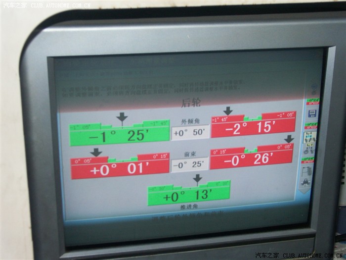 2、四轮定位到底怎么看,后轮数据我看到一个绿的,三个红的,不知道哪个是有问题的?谢谢下面兄弟的提示,后轮是不能调的,既然不能调,那就根本没必要测了。