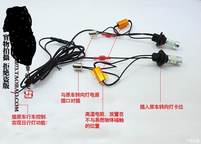 将原车灯牌拆下,把标有“与原车转向灯电源插口对接”的白色灯头座(接线头)装进原车塑料灯座即可,标有“接原车行车控制,实现日行灯功能”的红色线头接保险丝盒里面的BF4(用7.5A保险片),安装完毕。