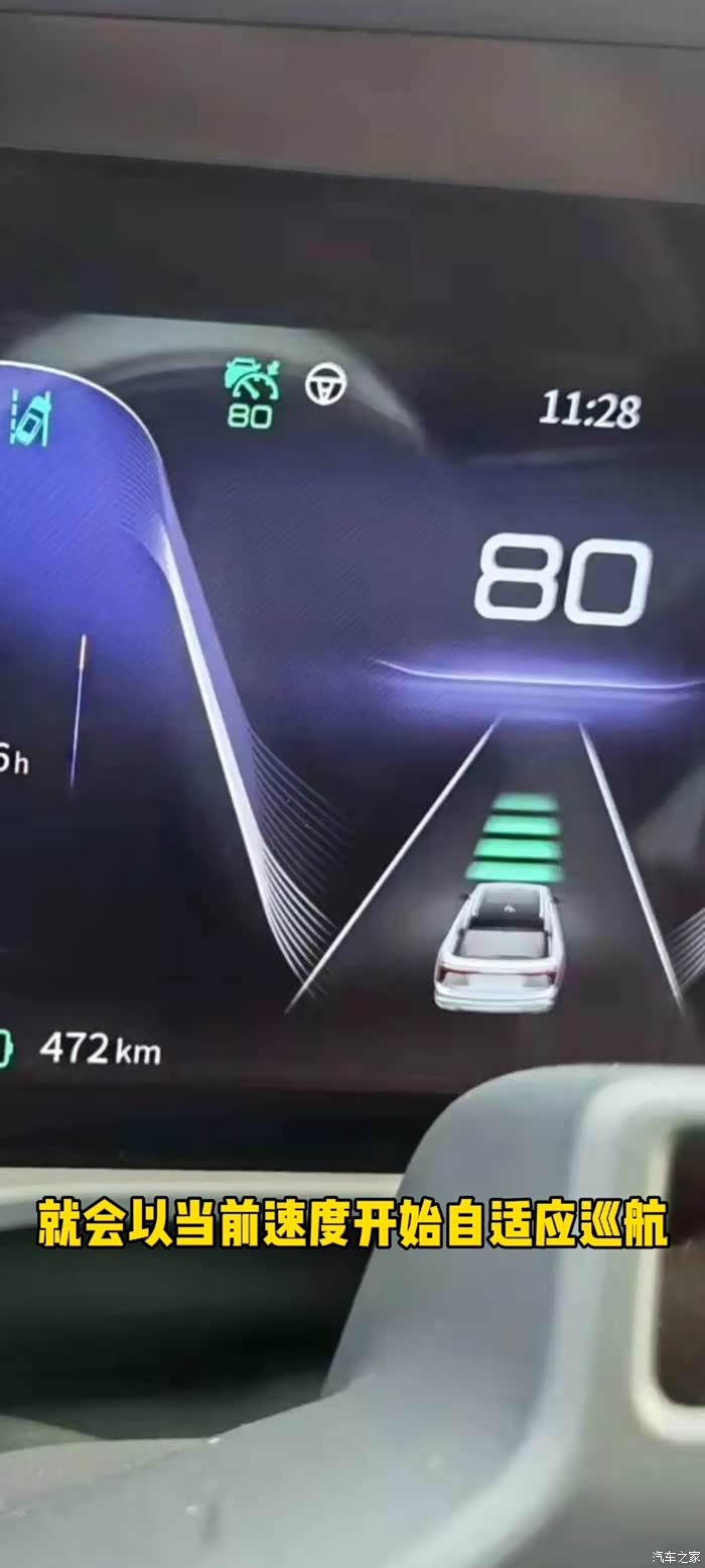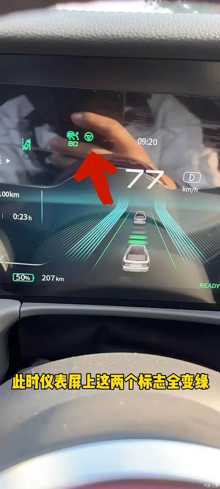 ▲车辆会自动根据前车速度调整你的车速,并且仪表屏上这个绿色标志会点亮。