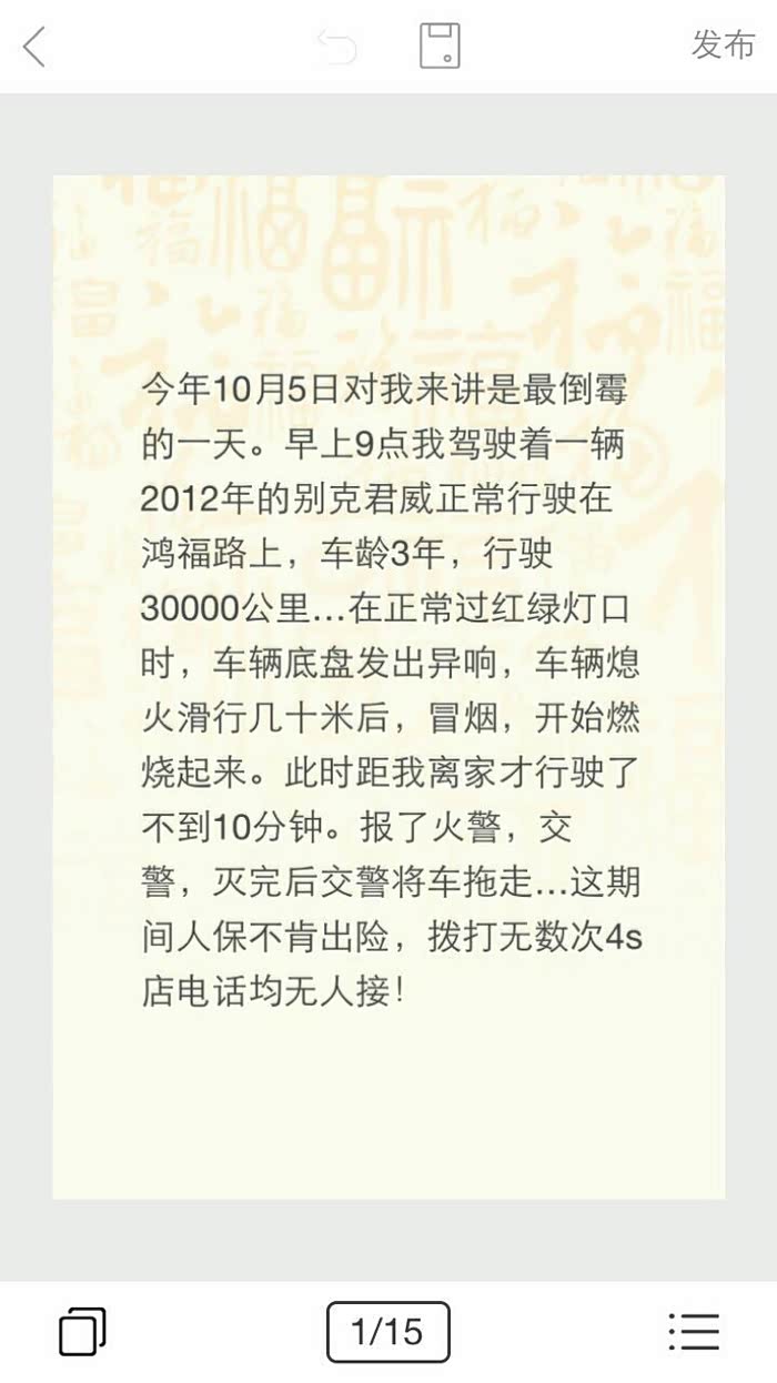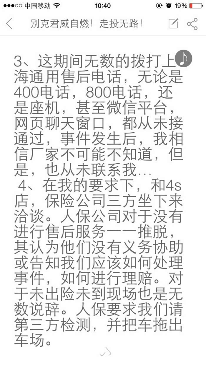 2015年10月5日,早9:09分,发生在东莞鸿福路本人开着别克君威2.0突然着火,4S店无人接听,保险公司不出险!火警到场后灭火,交警大队把车辆拖走!从10月5日到11月17日,本人与4S店和保险公司经过多次取证协商,都没有得到解决,本人又请了第三方检测公司检测,告知4S店检测结果为车辆本身问题,但得到的结果却是4S店让我们拨打上海通用厂家电话投诉,但是4008202020 拨打几天都无人接听,又给了座机号02150554580 还是无人接听,到现在厂家也没有主动联系过我,这件事情拖的我工作和生活都受到了严重的影响,我只能依靠媒体和法律来要回属于我的权利!也希望购买别克车辆的朋友们,购车谨慎!切记要选择好!