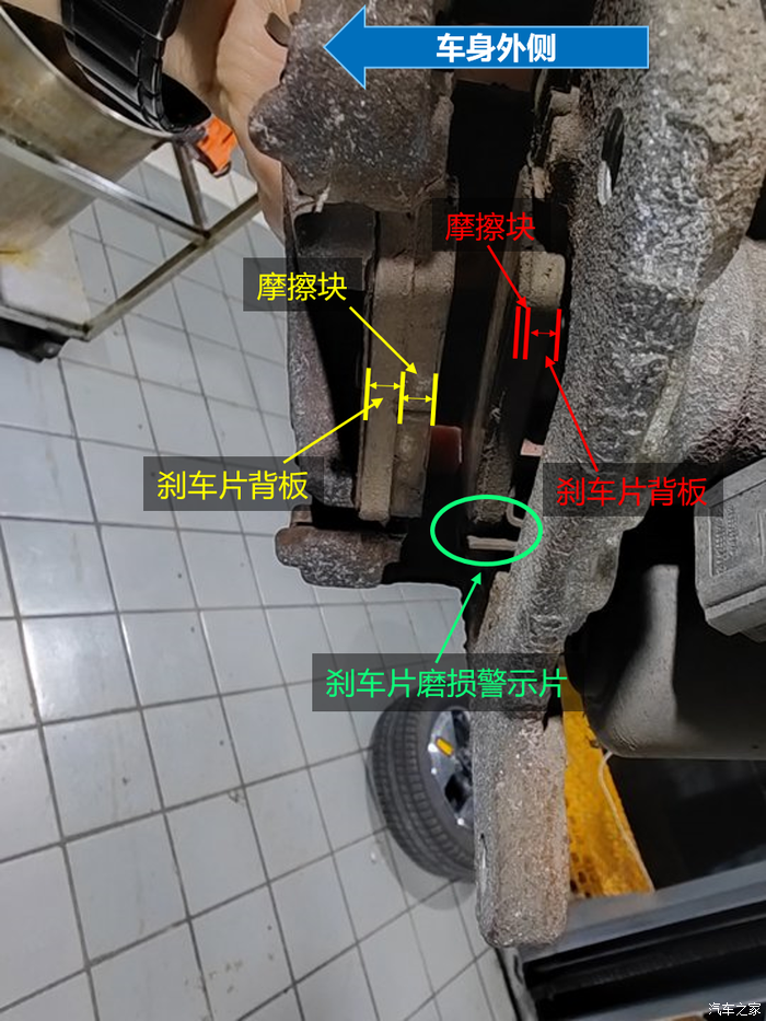 卡钳里靠外侧的刹车片大约还有5mm左右,几乎没什么磨损,而靠内侧的刹车片已经磨秃了,仅剩1mm左右,刹车的时候磨损警示的铁片已经开始磨刹车盘了。