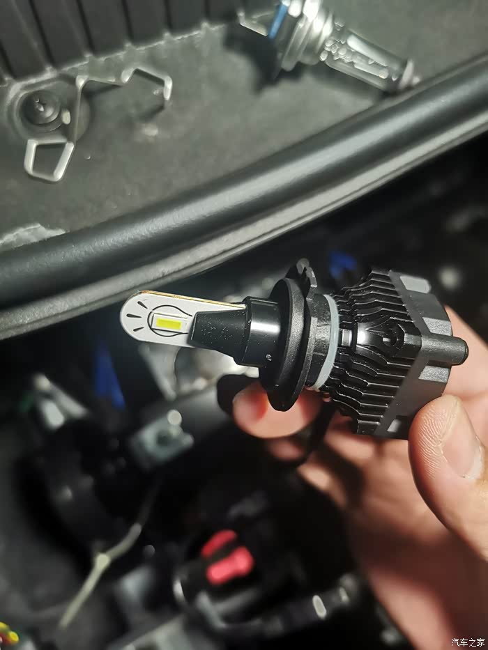 原厂LED,是真心难弄!不拆车只能两个手指操作,先拔灯插,然后会有一个卡簧,卸掉卡簧就可以旋转拿下灯珠了,LED拆掉中间的圆形卡片先转进去,再装好卡簧,最后才是把灯珠旋进去,我弄到第二个的时候卡簧掉灯罩里了,火大