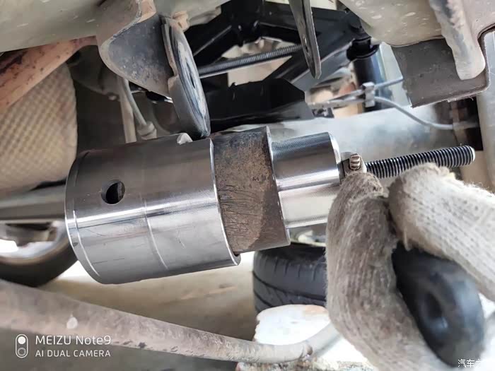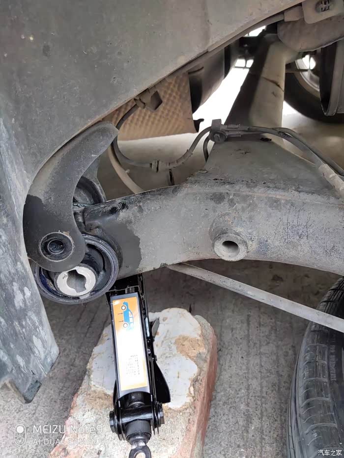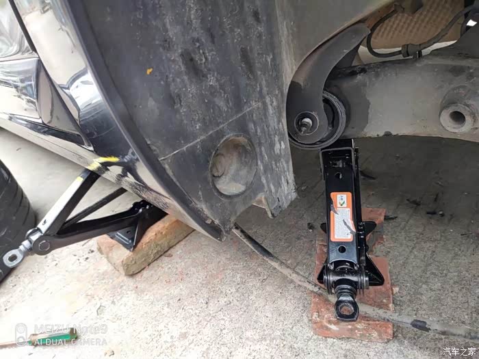 压进去胶套后,把上面的千斤顶移到下面顶起后桥,顶到合适的位置就可以装螺丝了,如果孔对不上可以用手摇一摇后桥就可以对上