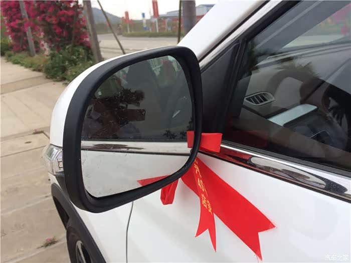 我最看中的是S7时尚的外观,很有硬派SUV的感觉。现在的后视镜一般都会带有加热功能,后视镜上的两条红丝带是店子里面送的,红色在中国象征着喜庆和美好,还有着辟邪、出入平安的象征。而且咱们挂了红丝带上路,一般的司机也知道这是辆新车,看到你起步慢呀龟速行驶呀,都会理解你让着点你的。