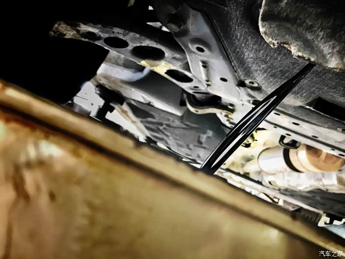 技师让我看看我的旧机油,,,,其实我觉得黑又亮,,,,但当我后边看到崭新的机油颜色才知道真的是该更换了。