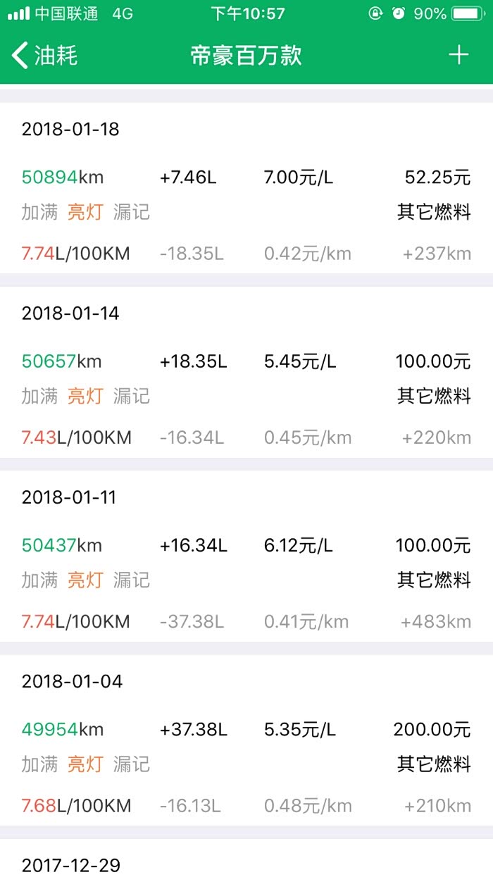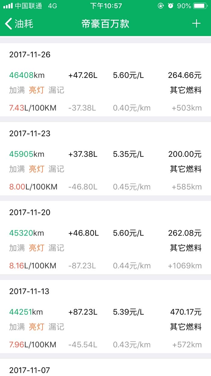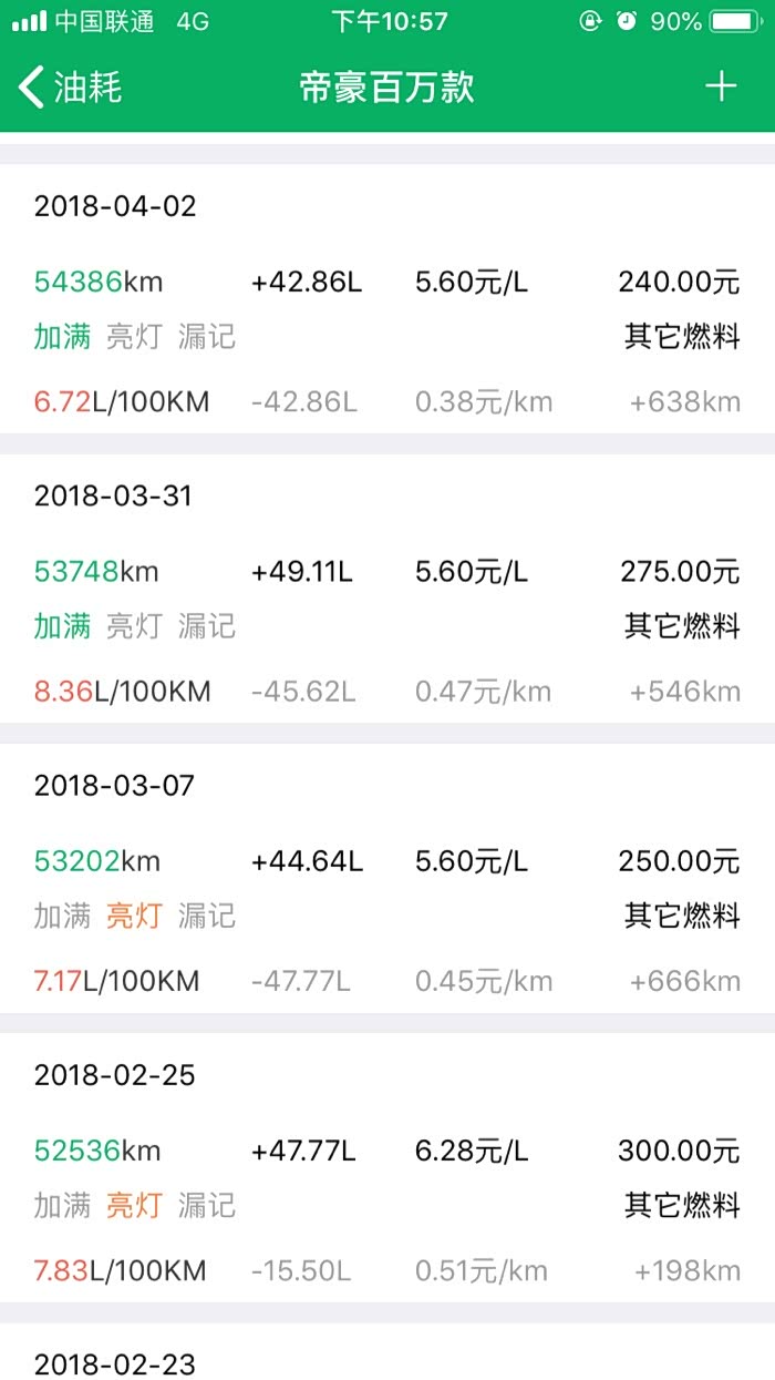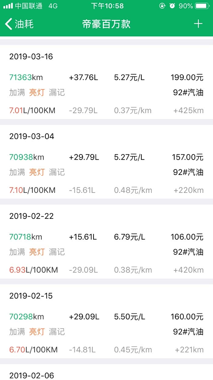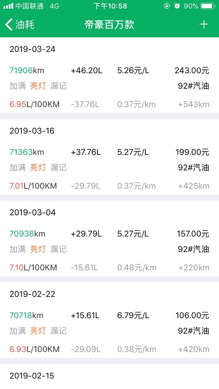 2016年10月27提车到2019年3月24,帝豪百万款的平均油耗是8.2升百公里,夏天空调不停跟冬天少开空调平均下来8.2升,最高时候一壶油跑出9.8升百公里跟6.1升百公里。所开道路市区路段占5成,高速1成,县道跟省道4成,,现在开71881公里,油费34198元,总平均每公里0.47元。不知道这个平均费用国产车是不是能接受。开到现在正常保养没有出现什么问题。下列是油耗记录图