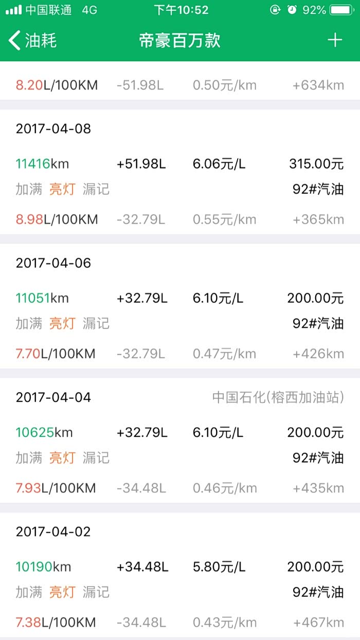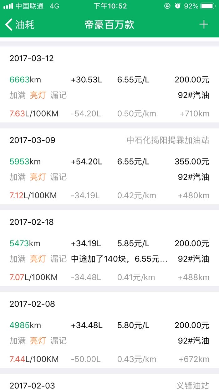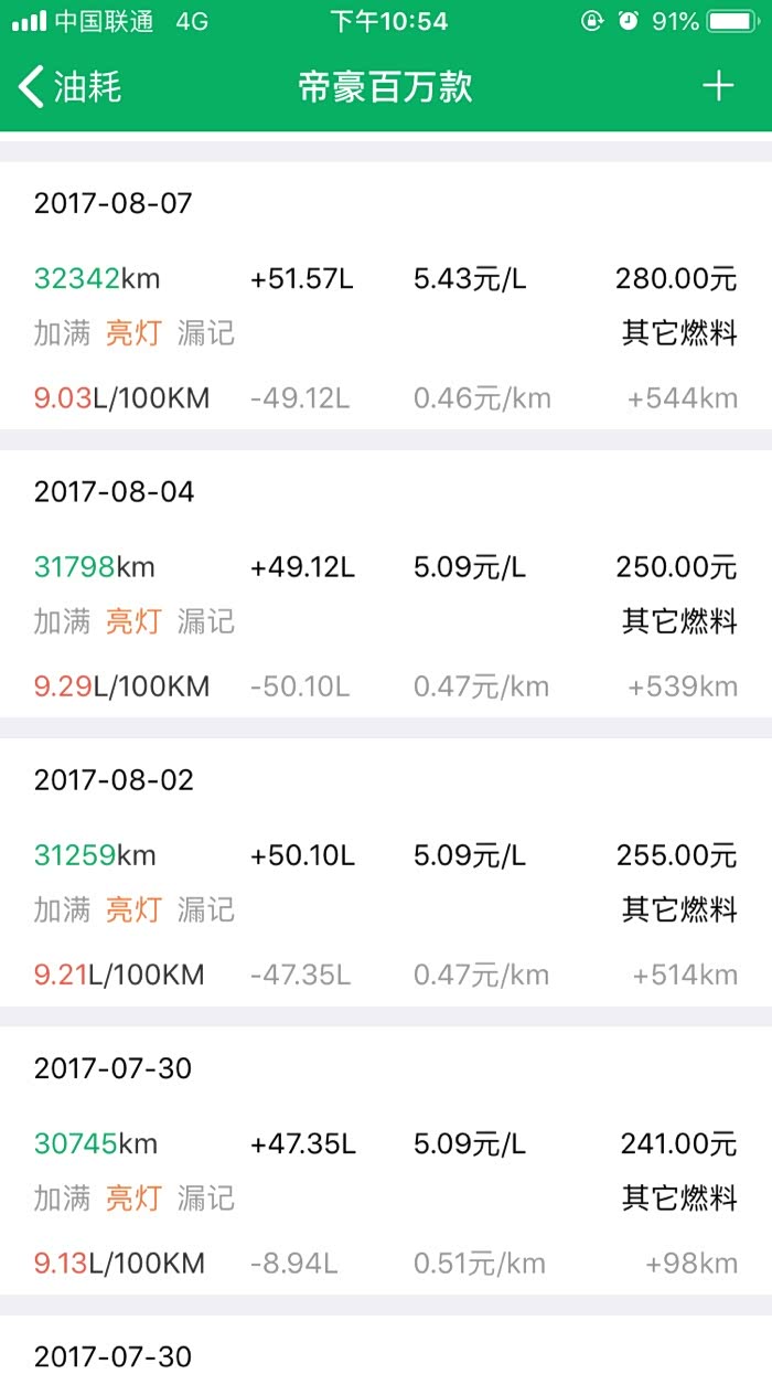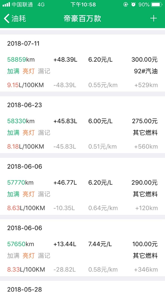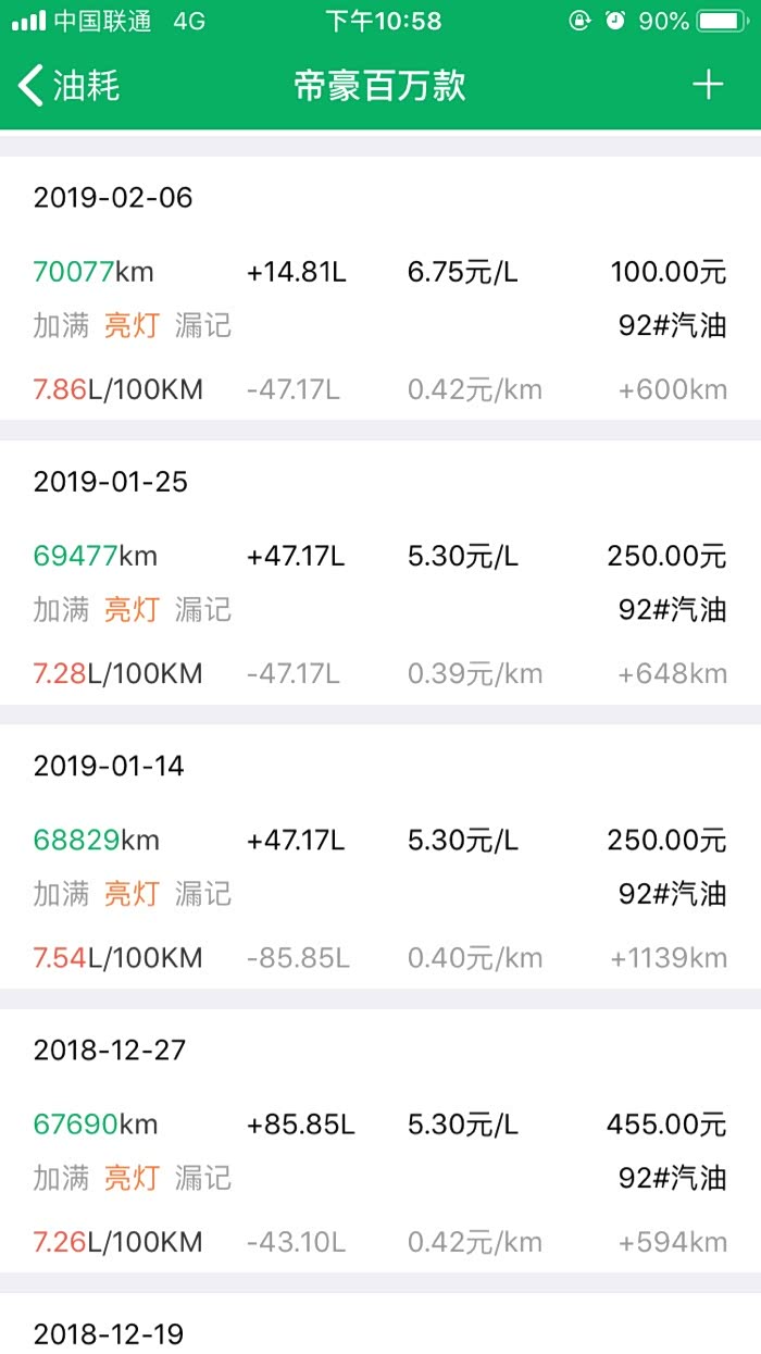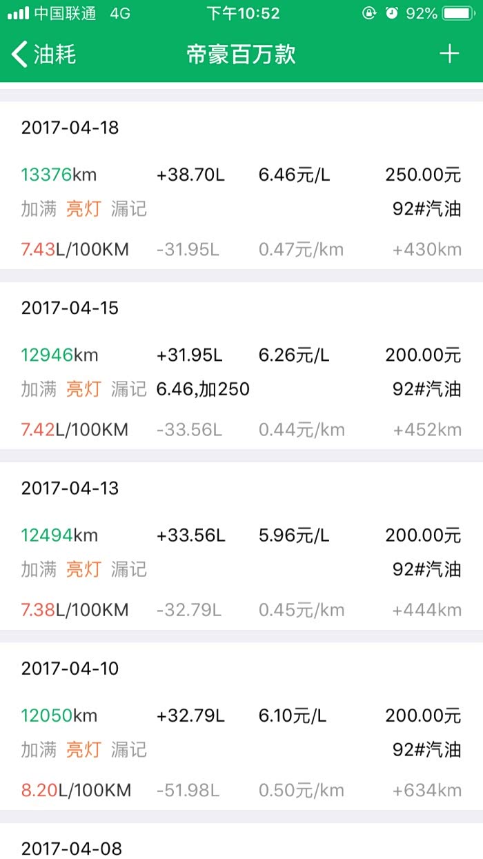 2016年10月27提车到2019年3月24,帝豪百万款的平均油耗是8.2升百公里,夏天空调不停跟冬天少开空调平均下来8.2升,最高时候一壶油跑出9.8升百公里跟6.1升百公里。所开道路市区路段占5成,高速1成,县道跟省道4成,,现在开71881公里,油费34198元,总平均每公里0.47元。不知道这个平均费用国产车是不是能接受。开到现在正常保养没有出现什么问题。下列是油耗记录图