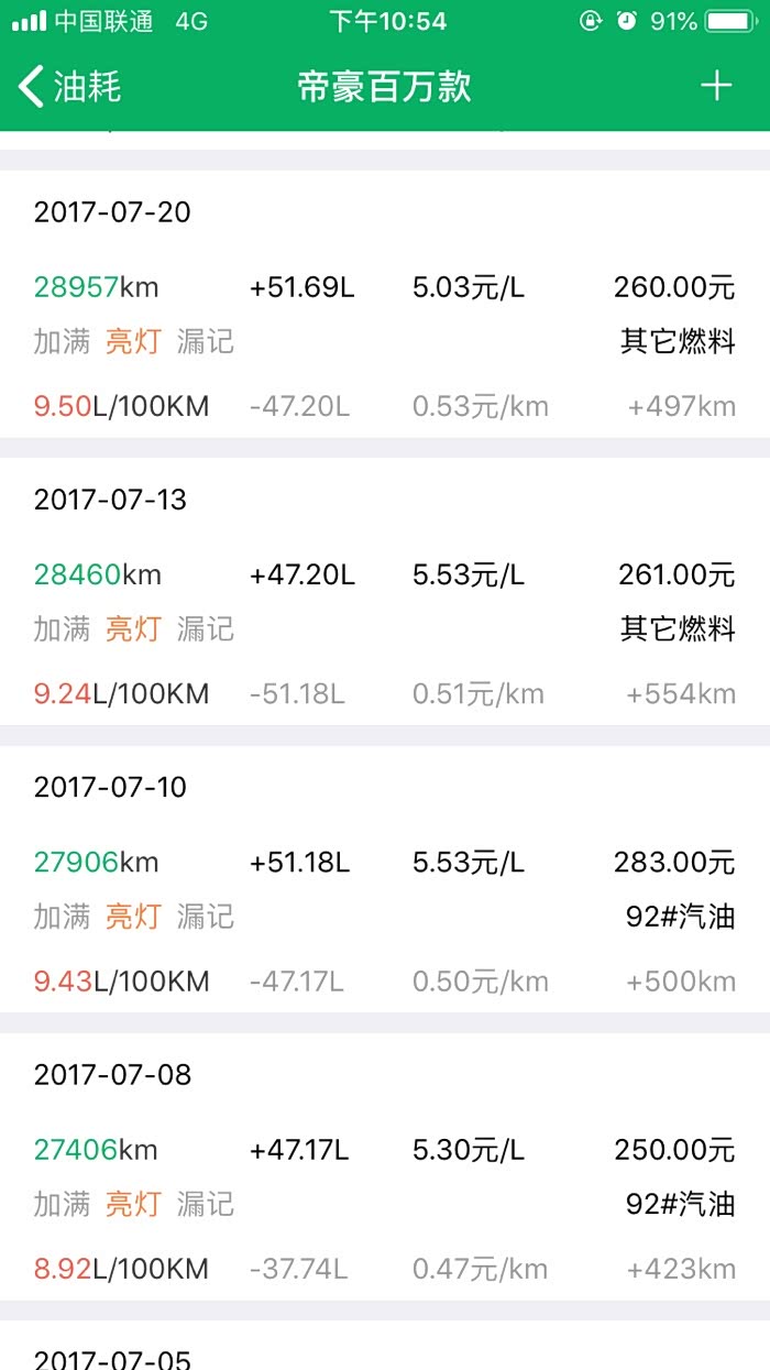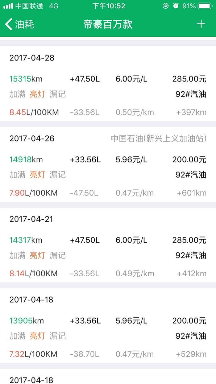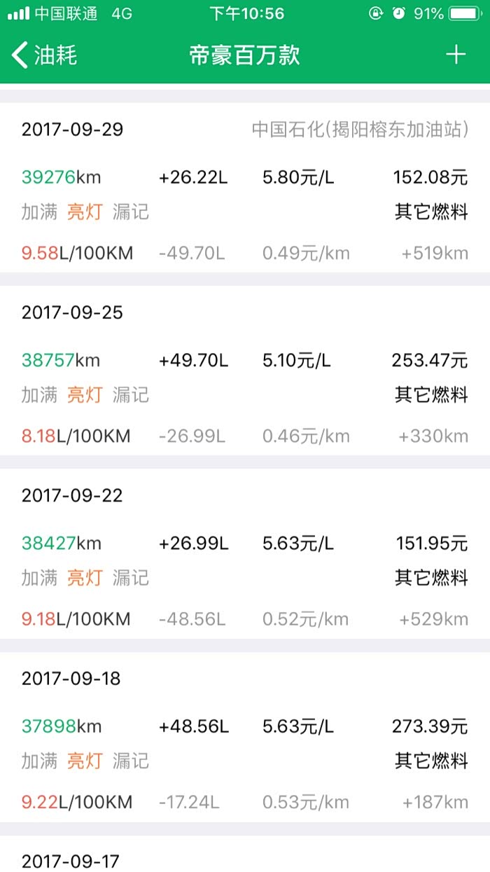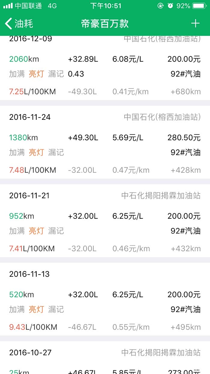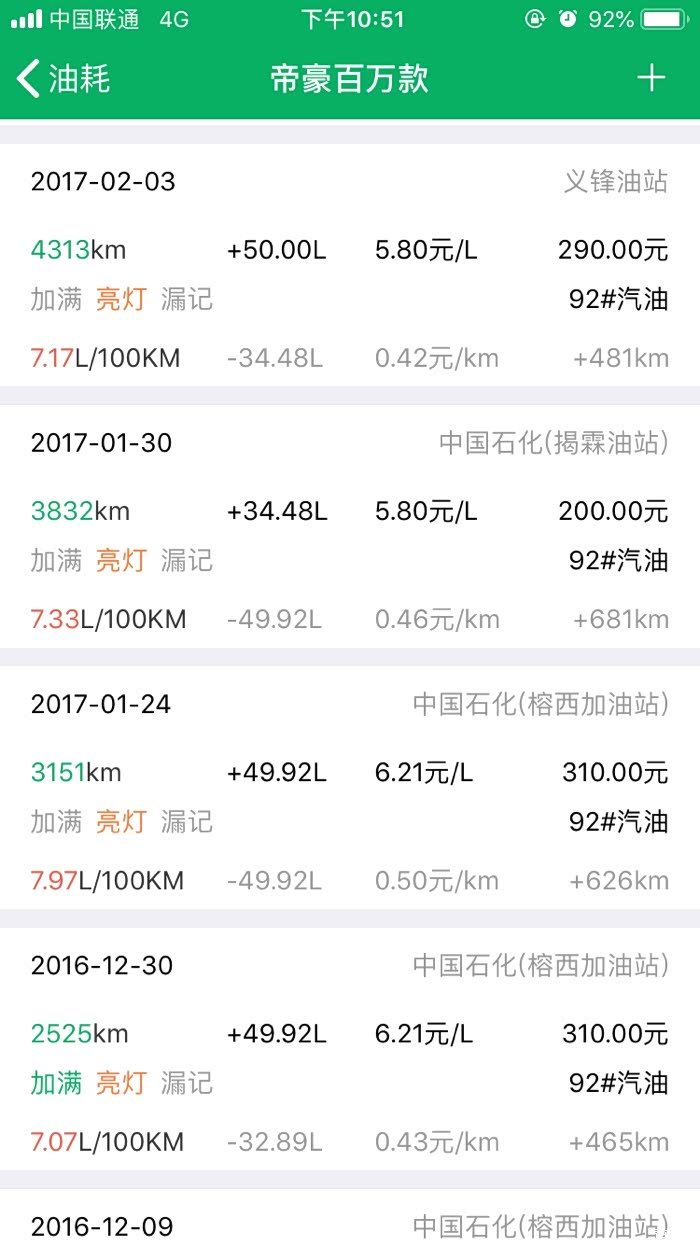 2016年10月27提车到2019年3月24,帝豪百万款的平均油耗是8.2升百公里,夏天空调不停跟冬天少开空调平均下来8.2升,最高时候一壶油跑出9.8升百公里跟6.1升百公里。所开道路市区路段占5成,高速1成,县道跟省道4成,,现在开71881公里,油费34198元,总平均每公里0.47元。不知道这个平均费用国产车是不是能接受。开到现在正常保养没有出现什么问题。下列是油耗记录图
