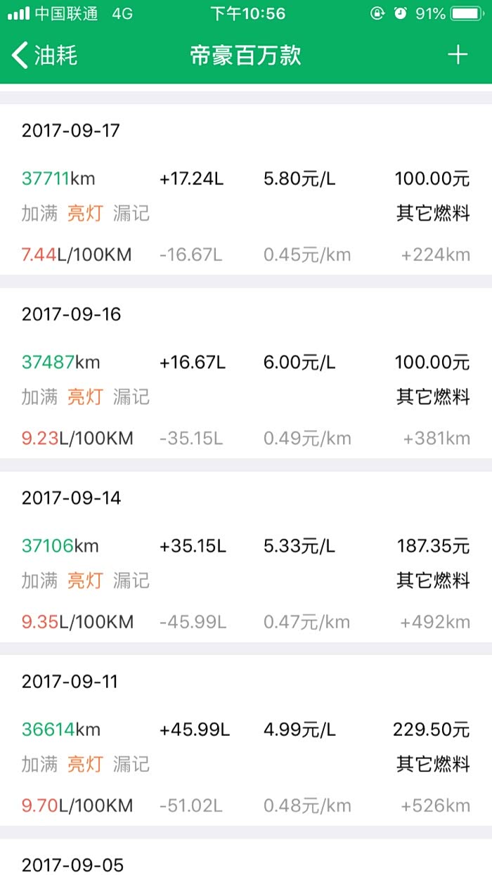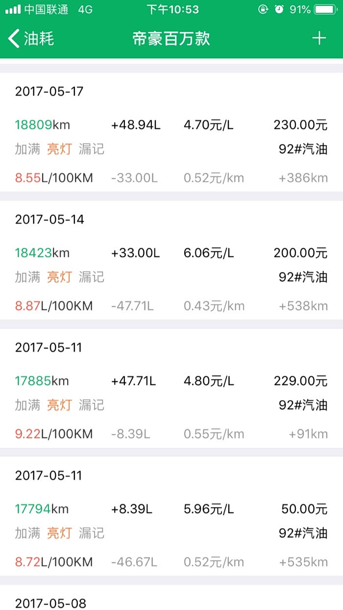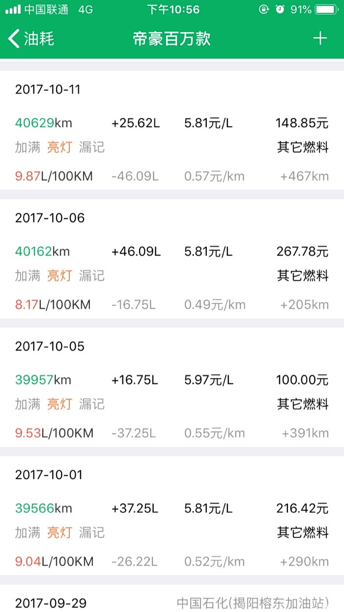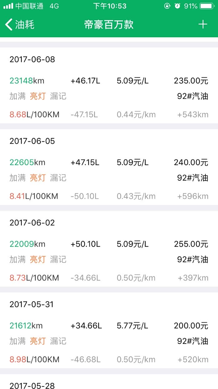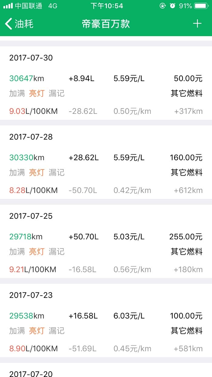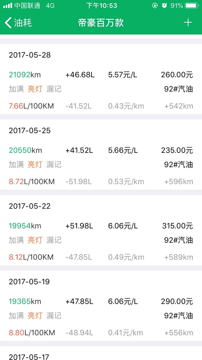 2016年10月27提车到2019年3月24,帝豪百万款的平均油耗是8.2升百公里,夏天空调不停跟冬天少开空调平均下来8.2升,最高时候一壶油跑出9.8升百公里跟6.1升百公里。所开道路市区路段占5成,高速1成,县道跟省道4成,,现在开71881公里,油费34198元,总平均每公里0.47元。不知道这个平均费用国产车是不是能接受。开到现在正常保养没有出现什么问题。下列是油耗记录图