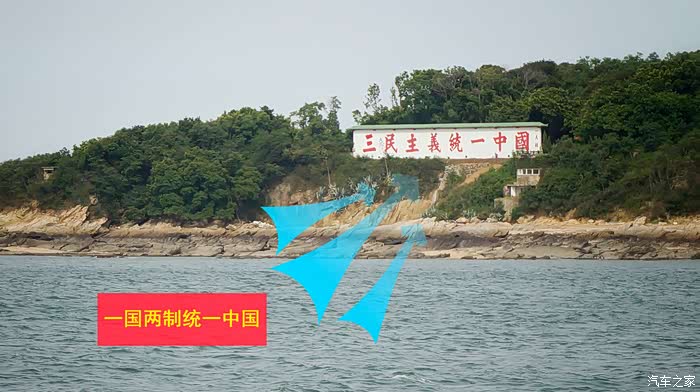 金门岛上写着“三民主义统一中国”,相对的在华夏大岛大陆这边写着“一国两制统一中国”