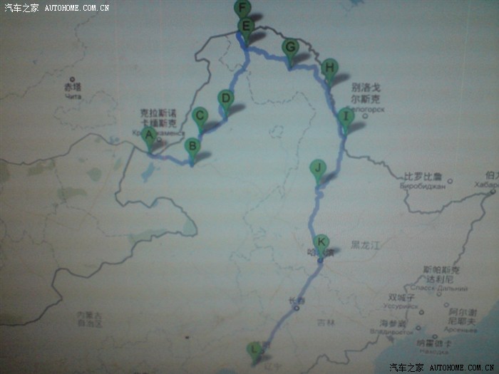 全程路线:A内蒙古自治区满洲里市-B海拉尔市-C额尔古纳市-D根河市-E黑龙江省大兴安岭地区漠河F北极村-G塔河县-H呼玛县-I黑河市-J五大连池市-K哈尔滨市-L辽宁省鞍山市。