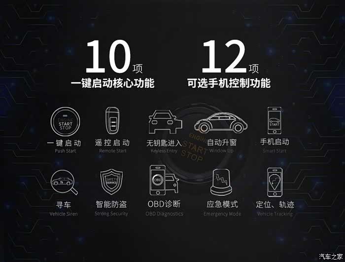 可以实现开锁、解锁;启动、关闭引擎(钥匙和手机控制启动还有预冷预热空调功能,尤其在夏天车停在露天停车场有很好的作用,提前启动车辆打开空调,上去开车的时候就不会想进了蒸笼一样);