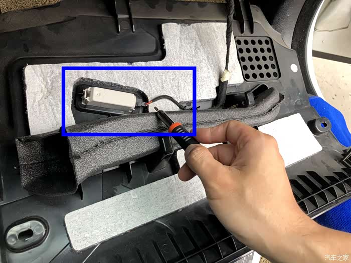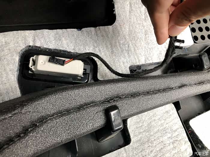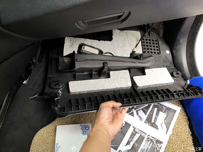 前要往上面轻轻一提起,然后再往外面一拽,手套箱下方的塑料壳子就掉下来了。