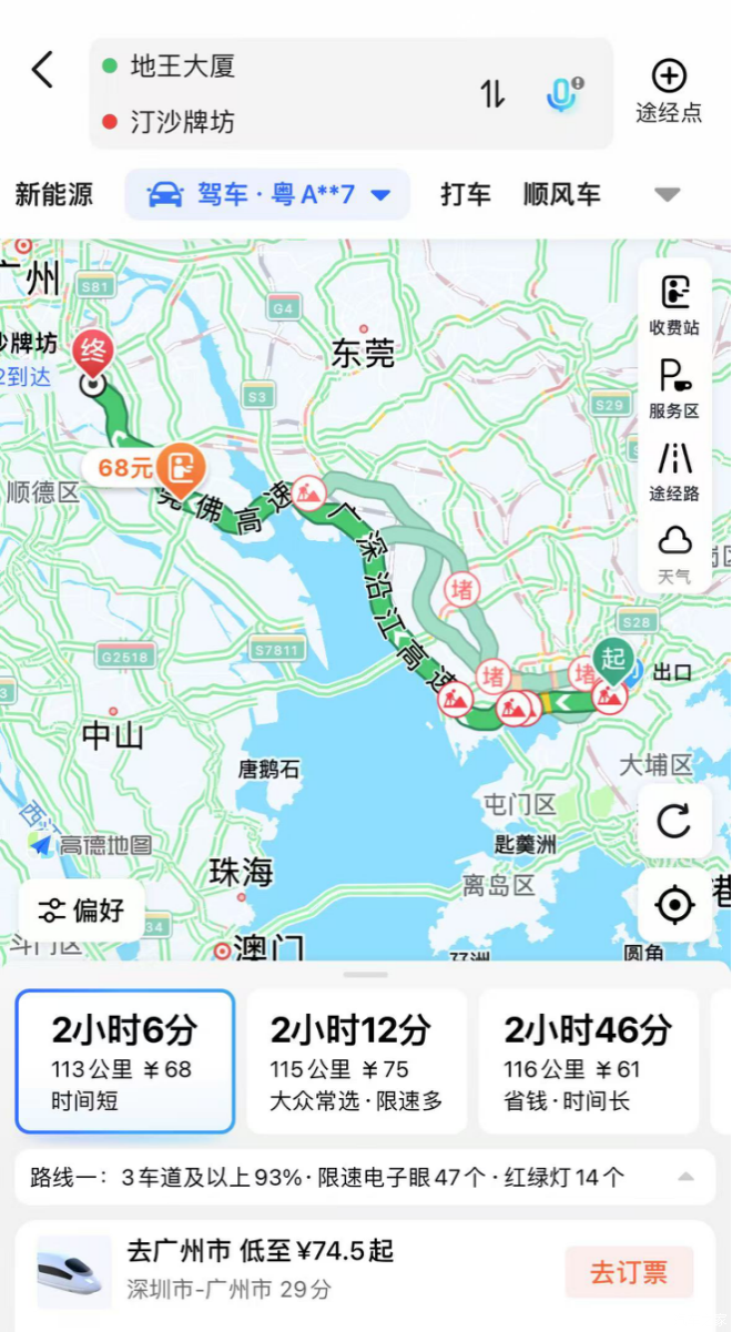 早就计划着和女朋友来一场说走就走的旅行,这一次,我们选择了自驾风神E70前往深圳,开启一段浪漫的两天一夜之旅。收拾好行李,带着满心的期待,我们踏上了这段充满未知与惊喜的旅程。我打开高德地图,默默地做着攻略,周六早上8点,从广州开始出发,目的地深圳。