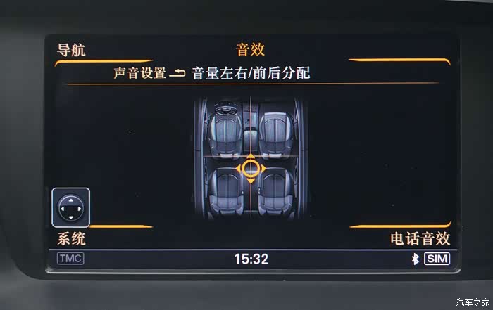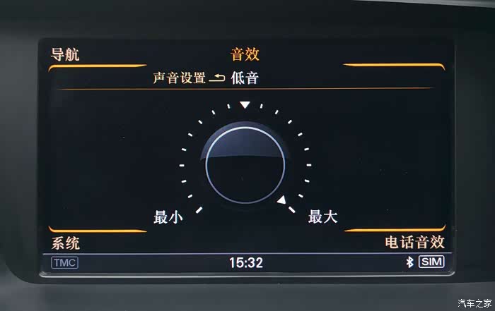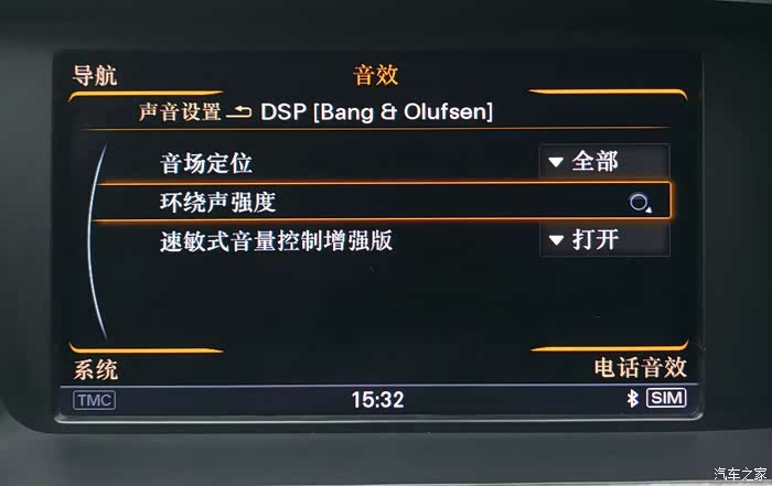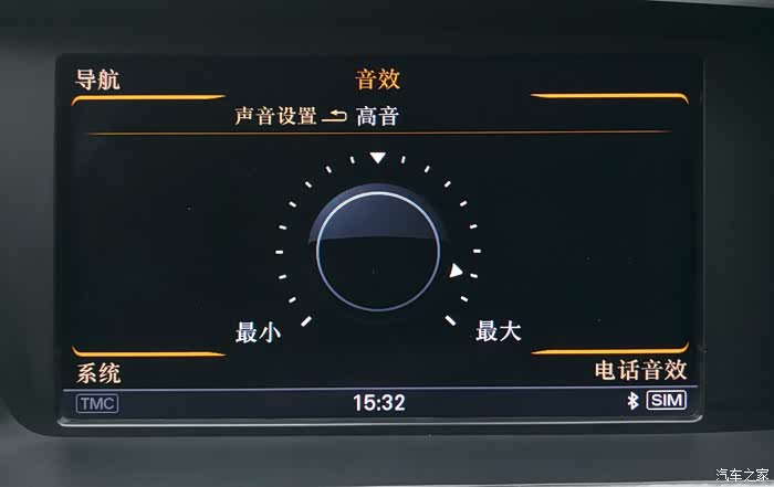 前置左右主声道各是由前门上的低音、A柱上的高音、仪表台上的中音3喇叭组成;中置声道是位于仪表台中间的1个宽频喇叭;左右侧环绕由后门上的低音、靠近B柱下端的高音2个喇叭组成; 后置左右环绕声道是位于D柱上的1个宽频喇叭;低音炮在后备箱备胎上。真正的8路独立输出系统,奠定了再现5.1声道的360°环绕效果。根据个人喜好,我的音效设置是低音、环绕调至最大,高音调至最大减2-3格,声场向后排调2格。这样设置使低音丰满有力、高音亮析不刺耳、360°环绕点位突出(注意,奥迪的各播放源诸如SD卡1、SD卡2、AUX、收音机、DVD、CD箱、蓝牙手机等的音效是独立设置的)。见下6图:
