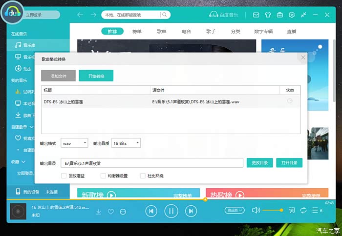 网上下载的2.0无损音乐,绝大多数都是WAV、APE、FLAC等。其中2.0声道 WAV封装文件均是PCM编码格式,直接通过M3U播放列表过桥寻址播放即可。而APE、FLAC格式是压缩无损音乐,奥迪MMI不能直接解析,需要通过【百度音乐】等类似软件的格式转换功能解压为适合奥迪的16位PCM编码WAV格式即PCM16-WAV,再通过M3U播放列表过桥寻址播放。百度音乐的格式转换使用方法:点击百度音乐顶部右端的小工具——格式转换,选择【输出格式】为WAV,【输出品质】为16Bits,然后添加文件、开始转换,即可得到奥迪MMI+B&O能解析的WAV格式无损音乐,见下2图(其它软件同理):