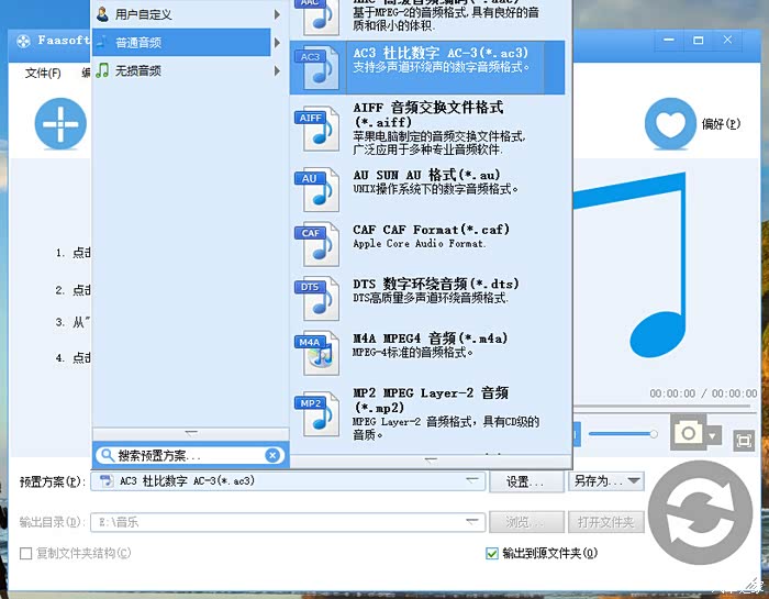 打开Fac软件,首先在【预制方案(P)】下拉框里选择【AC3杜比数字AC-3(*.ac3)】选项,然后在【设置】-高级-【采样率】里选44100,【比特率】选640K,【通道】里选择5.1。设置完成后,可点【另存为】保存为自定义,以后直接调用。见下2张图: