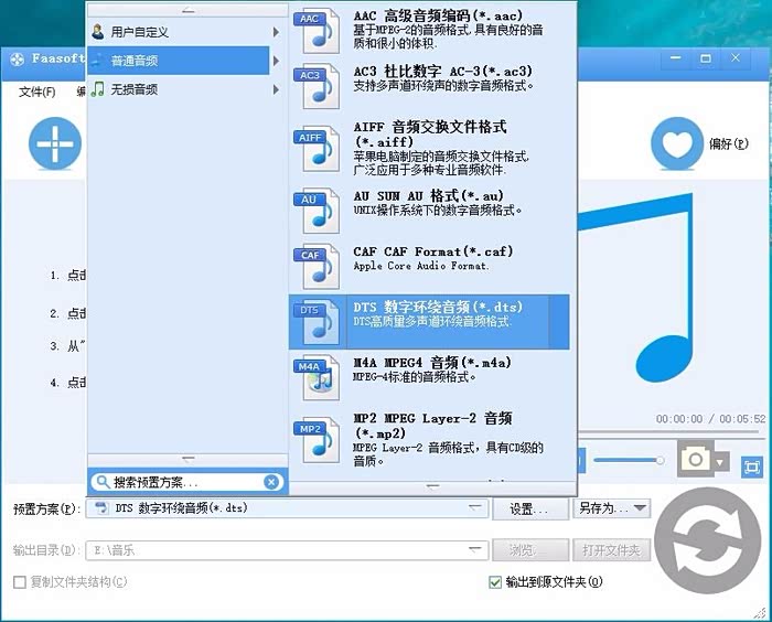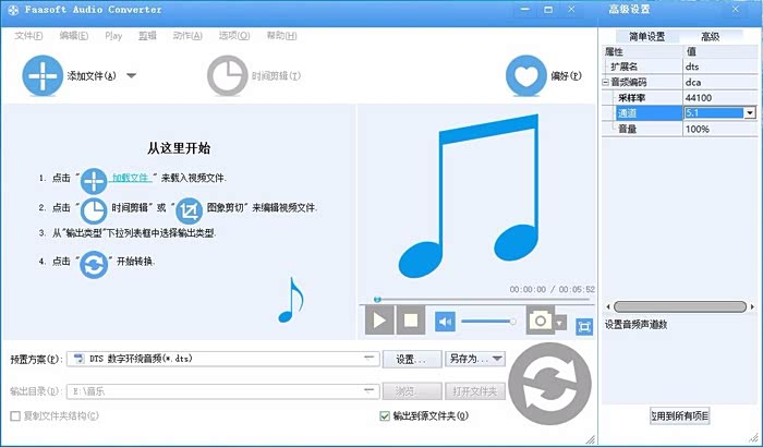 打开Fac软件,首先在【预制方案(P)】下拉框里选择【普通音频-DTS数字环绕音频(*.dts)】选项,然后在【设置】-高级-【采样率】里选44100,【通道】里选择5.1。设置完成后,可点【另存为】保存为自定义,以后直接调用。见下2张图: