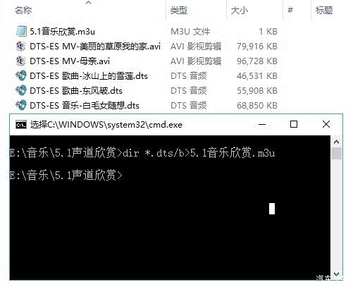 在DOS窗口命令行里输入dir *.dts/b>5.1声道欣赏.M3U,回车键,就生成了播放列表文件【5.1声道欣赏.M3U】