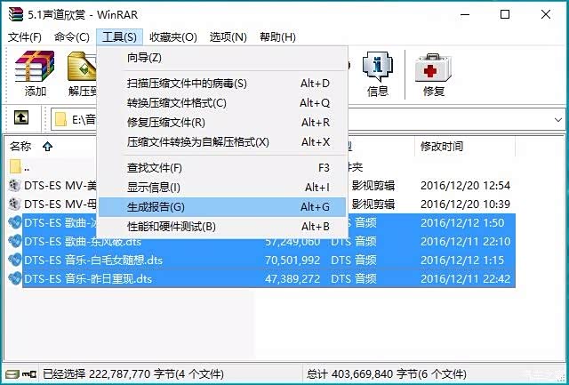 用winRAR(4.0以下版本)压缩软件,它可以快速生成目录文本文件,也就是播放列表M3U。打开winRAR软件,选择音乐文件夹,点选要列入播放列表里的音乐,再点击【工具】的【生成报告】,见下图: