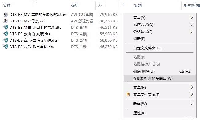 在将要制作M3U播放列表的音乐文件夹下按住shift键,同时鼠标右键单击文件夹空白处,在弹出菜单中选【在此处打开命令窗口】,继续在弹出的DOS窗口命令行里输入dir *.dts/b>5.1声道欣赏.M3U,回车键,就生成了播放列表文件【5.1声道欣赏.M3U】。WAV、AC3格式也需如法炮制M3U播放列表。见下两图: