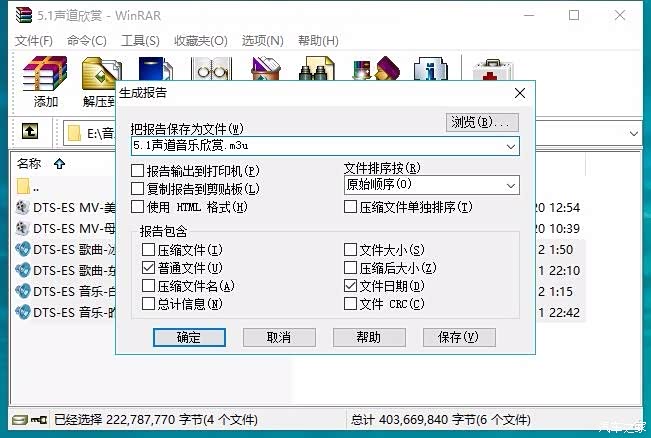 在弹出的【生成报告】窗口里按图示勾选项目,并输入文件名为5.1声道音乐欣赏.M3U,点击确定,自动生成【5.1声道音乐欣赏.M3U】播放列表文件,见下图:
