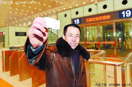 12月20日,第一个进入石家庄新火车站的旅客侯保全兴奋地举起车票,向众人展示。