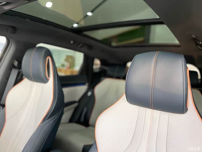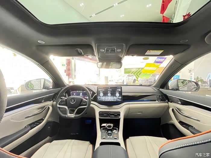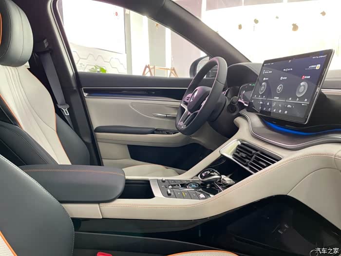 中控还是很科技感的,内饰也很漂亮,这个展车是灰色和米色内饰搭配的。撞色效果很强。