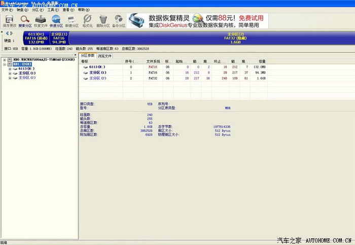 最后把下载到的2.57g的地图文件还原到最后的那个分区里就可以,注意新卡上的分区设定应该是第一个分区是FAT16,活动,第二个是fat16,主,第三个是FAT32,主。