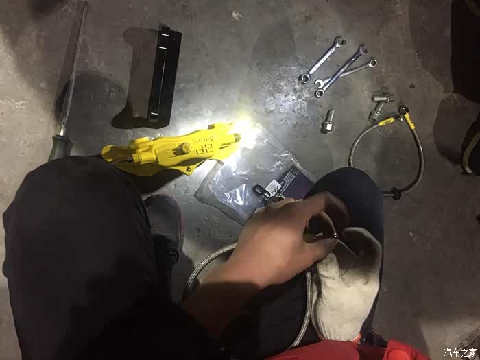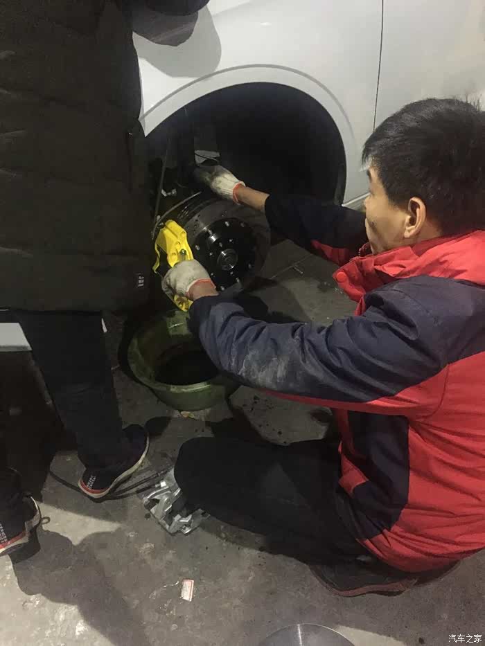 刹车盘、卡钳上车,油管放油调试中。。。刹车油路里如果存在空气,后果不堪设想。指不定哪一脚就失灵了。