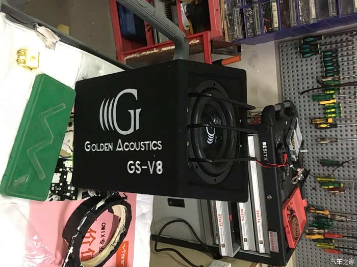 ,不敢想象这就是我的雷凌双擎。仅仅过了一个礼拜,我燥动的心又不平静了,事关我在焱哥店铺喝茶聊天时,发现了一台黄金声学单路功放,自己马上用手机查参数,这下可不得了了,最高功率可达1000W,如果用它来推我的超低音,这真是如虎添翼呀。结果人回到家,心还是想着那台单路功放,没过几天,我又去了焱哥那里,在我软磨硬泡之下,拿了一个相当不错的优惠价,还等什么?马上行动,装